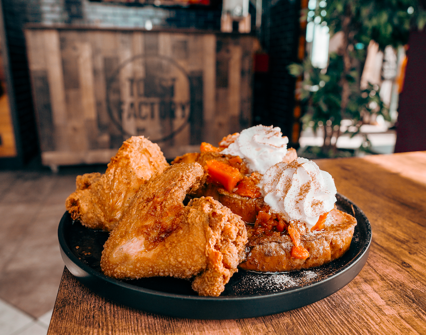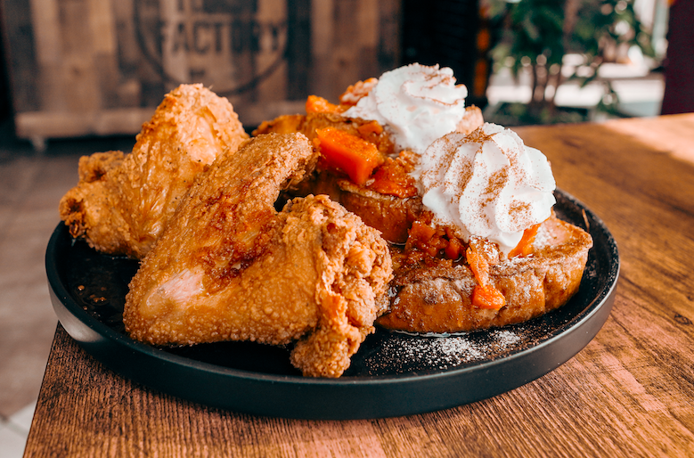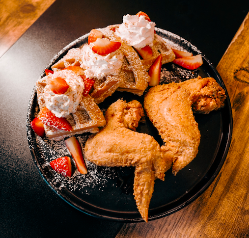 two jumbo wings matched with French Toast and layered with candy yams, topped with powdered sugar and whipped cream.
