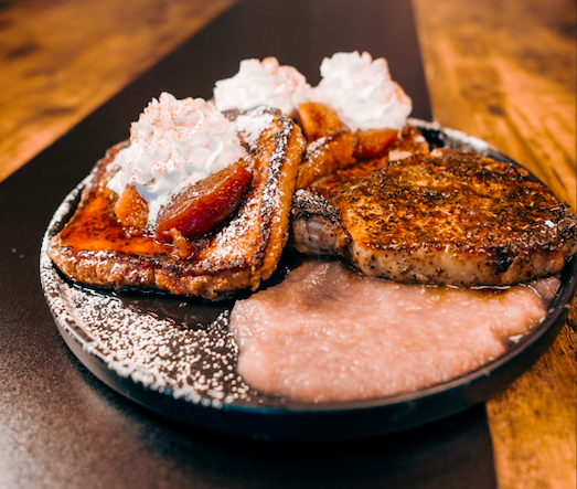 An apple topping over the french toast is paired with a marinated pork chop, seared in brown sugar and butter, and seated Atop A cinnamon apple sauce. An unxpected savory treat.